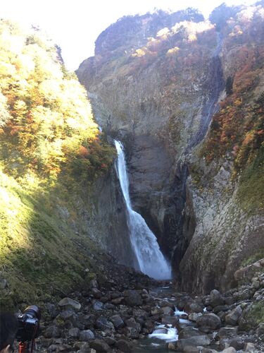 10月下旬の晴れた日、行楽日和だったので称名滝へ。ちょうど紅葉も見頃でした。 立山駅から出発したバスの終点より。 駐車場の方向。ここまでの道のり、山がずっと紅く燃えているようでした。 滝に到着する前から、既に絶景。空の色と山の色のコントラストが…